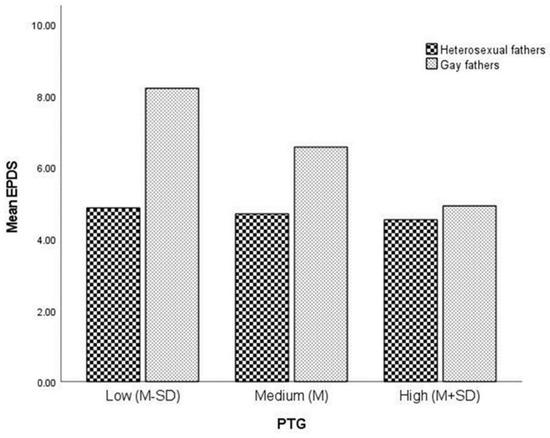 To explore the moderating effect of posttraumatic growth on group differences in postnatal depressive symptomatology, we used the PROCESS commutation tool (model 1). The results of this analysis are presented in Table 2. The significant interaction effect of sexual orientation and posttraumatic growth on postnatal depressive symptomatology increased the explained variance by 2.3%, as demonstrated in Figure 1. Simple effects were estimated at low (M − SD), medium (M) and high (M + SD) values of posttraumatic growth (PTGI). The results of this analysis showed that gay fathers had higher levels of postnatal depressive symptomatology than heterosexual fathers only when posttraumatic growth values were low or medium. These results are shown in Table 3. The results also suggest that the effect of posttraumatic growth on postnatal depressive symptomatology is stronger for gay fathers than for heterosexual fathers.