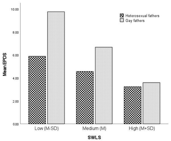 To explore the moderating effect of life satisfaction on group differences in postnatal depressive symptomatology, we used the PROCESS commutation tool (model 1). The results of this analysis are presented in Table 4. The significant interaction effect of sexual orientation and life satisfaction on postnatal depressive symptomatology increased the explained variance by 4.0%, as demonstrated in Figure 2. Simple effects were estimated at low (M − SD), medium (M), and high (M + SD) values of life satisfaction (SWLS). The results of this analysis showed that gay fathers had higher levels of postnatal depressive symptomatology than heterosexual fathers only when life satisfaction values were low or medium. These results are shown in Table 5. The results also suggest that the effect of life satisfaction on postnatal depressive symptomatology is stronger for gay fathers than for heterosexual fathers.