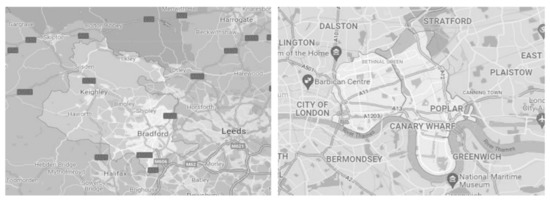 Maps of ActEarly study areas: Bradford Metropolitan District (left) and the London Borough of Tower Hamlets (right).