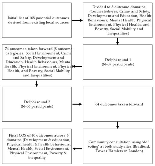 As ActEarly is a system-wide intervention, it necessitates system-wide outcome sets that incorporate multiple aspects of health, well-being and the physical and social environment in which the families and children of Bradford and Tower Hamlets live. The COS was deemed essential, not only to ensure consistency and comparability in what is being measured by planned project evaluations within ActEarly, but to facilitate a system-wide meta-evaluation of the whole ActEarly programme, including planned long-term economic modelling [10]. The lack of an agreed set of core public health outcomes specific to early years and childhood health and well-being that takes a whole-systems perspective was identified as a key gap in our evaluation work in this area. Rather than providing a wider selection of outcomes (i.e., similar to the PHOF framework), the COS presented here was intended to represent the ‘minimum’ required set of outcomes (though not necessarily excluding the inclusion of other outcomes). Thus, we aimed to develop the public health ‘Core Outcome Set for Early Years (COS-EY)’. The specific objectives of this COS development were to: