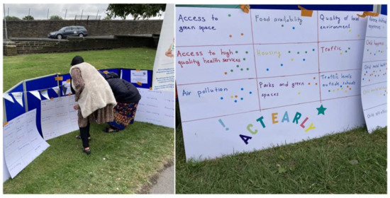 The eligibility criteria for participation in the community consultations were purposefully left open and included any adult attending any of the events at which the consultations took place. To widen the reach of the consultation, we conducted all three consultations in open, public areas. In Bradford, this included Horton Park and Peel Park. Both parks held free entry events that were visited by local children and families over the summer of 2021. In Horton Park, the event was an Eid celebration aimed at local families. In Peel Park, the event was a council-funded Play Bradford event. We estimate that each event was attended by 100+ local families but do not have exact figures. We did not collect demographic, social or health information from the families but most participants arrived at the events on foot from the surrounding neighborhoods. In Tower Hamlets, the consultation was conducted in collaboration with the Bromley by Bow Centre who identified the Old Ford Road Summer Fun Day event at Butley Court as suitable for the consultation.