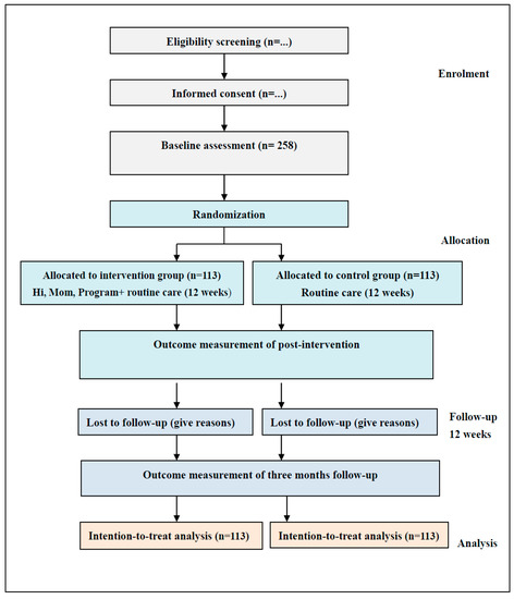 The research will be conducted in the maternity wards of three affiliated hospitals in X University, where each hospital has an annual baby-birth record of more than 4000. All women admitted in the wards will be approached by researchers to ask their willingness and will be measured by the EPDS before recruitment. If they have an EPDS of 10 or more, they will be eligible to participate in this study. The information sheets, posters, and leaflets will be used to introduce the purposes and process of the research before recruitment. If rural-to-urban floating women meeting the inclusion criteria are willing to participate, they will be asked to sign an informed consent form and be informed of freedom to withdraw whenever they want. The CONSORT (consolidated standards of reporting trials) [48] flowchart is illustrated in Figure 1. The recruitment period is expected to extend over a 3-month period. Recruitment of participants began in May 2022. Primary endpoints (baseline and postintervention), follow-up measure (three months), and data analysis are expected to be complete in January 2023.