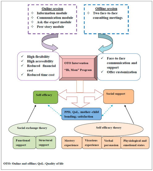 The “Hi, Mom” program of OTO intervention will integrate two face-to-face consulting sessions with online sessions including an information module, a communication module, an ask-the-expert module, and a peer story module over a period of three months. According to the self-efficacy theory, the mastery experiences of participants will be acquired by provision of the related PPD information via the information module, ask-the-expert module, and face-to-face consulting. Vicarious experiences of women can come from the peer support module where women may share their successful experience of dealing with PPD. Verbal persuasion can be gained from feedback, comments, and suggestions from health professionals in the ask-the-expert module and other mothers in the communication module. The physiological and emotional states can be improved through the above various supports, information and feedback in the information module, communication module, ask-the-expert module, peer story module, and face-to-face consulting. In terms of the social exchange theory, the structural social support, including the formal and informal social network of women, can be built; and various kinds of functional supports, such as informational support, material support, emotional support, and evaluation of support, can be provided from the health professionals and others through the designed information module, communication module, ask-the-expert module, peer story module, and face-to-face consulting.