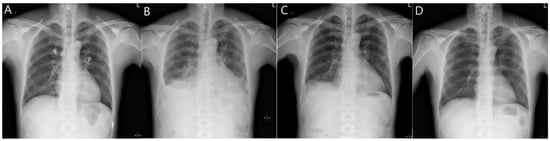 Changes in plain chest radiography (PA) with the clinical course. (A) No active disease at the time of admission. (B) Deterioration during hospitalization (6 days after admission); pneumonia or pulmonary edema; bilateral pleural effusion or thickening. (C) Improvement in pulmonary edema 13 days after admission. (D) No active disease at the time of outpatient follow-up (7 days after discharge).