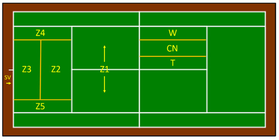 If we analyze the zone to which the service is directed, it has been shown that, on hard court with first services, 44.8–39.9% (deuce-advantage) were directed to the T zone, 41.2–44.9% to the wide zone and 13.9–15.2% to the center. Some previous research has also analyzed the service direction, but without taking into account the side of the service [] obtaining that, with first services on hard court, 47% go to the T zone, 36% wide zone and 16% to the center, while 41% go to the T zone with second services, 35% to the center and 23% wide zone. On clay, there are also investigations that studied the service direction [], concluding that, with first service, 38% go to the wide zone, 34% to the center and 27% to the T zone. With second services, it was evidenced that 31% go to the wide zone, 57% to the center and 21% to the T zone. In our case, also on clay (distinguishing by service side), 48.8–37.2% of the first services were to the wide zone, 17.8–22% to the center and 33.3–40.8% to the T zone. With second services, 16–44% was to the wide zone, 40.7–42.9% to the center and 43.2–13.1% to the T zone.