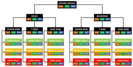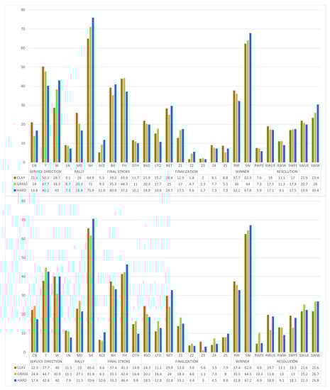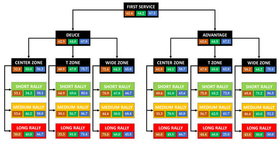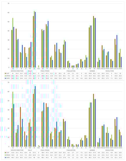 More performance factors include the first serve and return ratings because the match winners have the best values for these variables, regardless of sex [,]. Regarding the service and the effectiveness in the final point resolution, the direction is also important, which varies according to the type of court, with differences between the first and second service [,], varying the percentages of effectiveness.