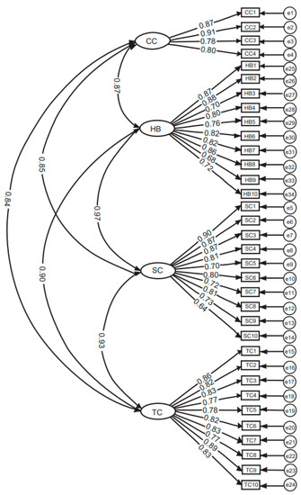 The four-factor model of the TITC-T was tested by CFA. Because the number of participants in our study exceeded 200, which can result in false positives when an χ2 index is used, we included the chi-squared value/degree of freedom (χ2/df) index [43]. In the analyzed sample (n = 275), indices of goodness of fit for CFA were as follows: χ2/df = 4.213, the goodness of fit index (GFI) = 0.832, the adjusted goodness of fit index (AGFI) = 0.973, the normed fit index (NFI) = 0.985, the incremental fit index (IFI) = 0.995, the comparative fit index (CFI) = 0.995, the Tucker–Lewis index (TLI) = 0.908, and the root mean square error of approximation (RMSEA) = 0.098. These indices indicated a good fit with the data; χ2/df = 4.213 suggested the model had an acceptable validity [44]. Thus, the model was considered appropriate.