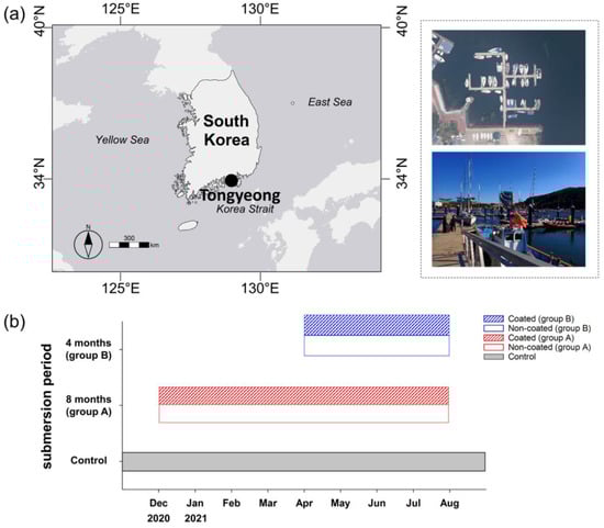 The present study was conducted at the Marine Sports Center (34°49′38.80″ N, 128°26′4.22″ E) in the city of Tongyeong (Figure 1a) in Gyeongsangnam-do in the southern part of the Korean Peninsula. Study sites were located in places where yachts and ships are loaded in the harbor, and various artificial structures—such as port walls and floating docks—exist. The control group was an acrylic substrate (300 × 300 mm), and was installed on three columns at the yacht yard in April 2017. Three columns were selected as replicates, and fabric substrates (300 × 300 mm) with and without superhydrophobic coatings on the surface were installed at a depth of 3–4 m in December 2020 (group A) and April 2021 (group B). The contact angle of the superhydrophobic surface was 0.6°. After installing the fabric substrate in December 2020, eight scuba surveys were conducted every month from January 2021, and the coverage of the attached invertebrates was recorded until August 2021. Biological factors (i.e., species richness and coverage) were recorded in the survey log, and photographs were obtained using a camera (ZV-1, Sony, Japan) to estimate the changes in recruitment and species composition over time. In addition, the depth of the substrate was estimated at each point using a dive computer (Descent™ Mk1, Garmin Ltd., Olathe, KS, USA) during the field survey.