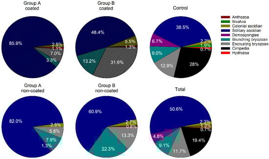 Solitary ascidians, including A. aspersa and C. robusta, were the dominant taxa with the highest mean coverage, followed by the branching bryozoan B. neritina. In particular, the coverage was relatively high in July (summer). In July, the mean coverage of A. aspersa and B. neritina on the non-coated substrate in group A was 57.6% and 16.5%, respectively. Among all taxa, Anthozoa, Cirripedia, and Hydrozoa did not exceed 5% mean coverage during the study period in groups A and B, nor in the control group. During the initial colonization period (1–4 months), the mean coverage in groups A and B was markedly lower than that in the control group. After May, as the total biomass increased, the mean coverage in groups A and B as well as the control group showed a similar trend. However, the branching bryozoans in groups A and B showed a different trend from those in the control group, as an exception. In July and August, the mean coverage was approximately 10% higher on the non-coated substrate in groups A and B (Figure 2 and Figure S1).