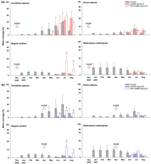 We then analyzed the contribution of species to the significant differences between the coated and non-coated substrates using SIMPER analysis. A. aspersa made the greatest contribution in both groups A and B, producing the greatest effect on differences in coverage between the coated and non-coated substrates. Next, the species making the second-greatest contribution were C. robusta in group A and B. neritina in group B. In particular, the top three dominant species in group A were colonial ascidians and branching bryozoans, with high mean coverage during summer. The species making the third-greatest contribution in group B was Watersipora subtorquata—an encrusting bryozoan. Therefore, the top four species that contributed the most to the differences between coated and non-coated substrates in groups A and B were A. aspersa, C. robusta, B. neritina, and W. subtorquata (Table 2). In group A, A. aspersa and C. robusta showed significant differences between the coated and non-coated substrates (p < 0.05), with a higher coverage on non-coated than on coated substrates in May. After May, there were no significant differences among the solitary ascidians in group A (p > 0.05); however, in group B, the coverage of A. aspersa was higher on non-coated than on coated substrates during June–August (p < 0.05). Similarly, significant differences were noted in the coverage of C. robusta in group B during July (p < 0.05). In both groups A and B, the coverage of B. neritina was higher on non-coated substrates in July and August (p < 0.05). Conversely, in both groups A and B, the coverage of W. subtorquata did not significantly differ between the coated and non-coated substrates during the study period (p > 0.05; Figure 3).