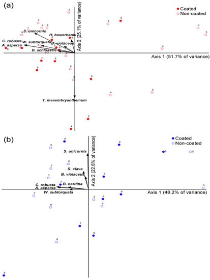 Results of nMDS analysis showing differences in sessile invertebrate communities between coated (close) and non-coated (open) substrates during the study period. Taxa present in over 5% of the samples are included. Biplot shows the linear relationships between nMDS ordinates and species coverage. The red and blue dots indicate groups A (a) and B (b), respectively. Each number indicates a time point.