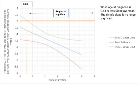 The model that tested the moderator role of illness years in the relationship between pain willingness and psychological inflexibility in pain in headache group was significant [F(3, 57) = 16.14, p < 0.001; β = −0.42, 95% CI (−0.079, −0.058), t = −2.32, p = 0.024], explaining 46% of variance. Hence, there was a negative relationship between pain willingness and psychological inflexibility in pain in the headache group when the illness years variable was high (β = −1.95, 95% CI [−2.58, −1.32], t = −6.23, p < 0.001). The Johnson-Neyman technique showed that pain willingness was significantly correlated with psychological inflexibility in pain in the headache group when the standardized value of illness years was 0.63 above the mean (β = −0.75, p < 0.050), and this was true for 93.44% of the sample (Figure 1).
