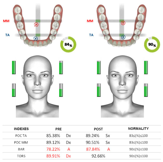 When comparing the mean values at t0 and t1, the t-test for paired data showed statistical significance in the difference of pre- (0.860 ± 0.124) and post-treatment (0.880 ± 0.114; p = 0.023) and torsion values in the pre- (0.822 ± 0.134) and post-bite (0.855 ± 0.150; p = 0.034) barycenter (Table 3) [30,31,32,33].
