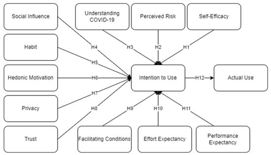 PMT is a framework that aims to measure the coping appraisal and threat appraisal of health-related studies []. Prasetyo et al. [] considered the integration of PMT and TPB in measuring the effectiveness of community quarantine in the Philippines. Their study highlighted that understanding the risks and vulnerability presented key factors in how people would perceive the protocols as effective. In addition, Ong et al. [] integrated similar theories to measure the acceptance of a technology. Similarly, their study showed that if people would understand the benefits the technology may present, they would have high levels of acceptance. Moreover, several studies have shown that people would trust a technology when there is less threat and high privacy upon using it [,]. Consequently, Yu et al. [] integrated PMT and UTAUT2 in measuring factors affecting the intention of using mhealth education. Therefore, the use of the integrated theories is justified to completely measure the intention of utilizing the health-related applications, which will lead to an effect on actual usage.
