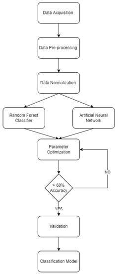 Presented in Figure 2 is the methodological flowchart utilized in this study. Data acquisition was the first thing done, followed by data pre-processing and data normalization. The dataset was then considered as the input variables for both machine learning algorithms. Parameter setting and optimization was conducted, followed by the validation and generation of a classification model. Lastly, result interpretation was conducted.