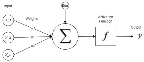 ANN data pre-processing was conducted utilizing correlation analysis, similar to the pre-processing technique employed with RFC [,]. Optimization of ANN parameters were conducted to determine the optimum model. The activation functions such as swish, relu, and tanh for the hidden layer was considered. For the output layer, sigmoid and softmax were considered. Lastly, optimizers such as adam, RMSProp, and SGD were considered [,]. Represented in Figure 3 are the operations done by the ANN.