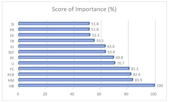 PMT factors such as U, PCR, and PT were seen to have a significant effect on IU. Ong et al. [] showed how U presented to be one of the most significant factors affecting a positive behavior towards mitigation when threat among people is evident. Their study presented that when health and well-being are considered, people would highly consider their safety due to their understanding of the event. In addition, another study [] showed how the acceptance of technology would be based on people’s understanding. The benefits of a technology will outweigh threats if people understand how it could positively affect their lives. Moreover, if PCR is evident, people would have the intention to mitigate all possible appraisals []. Featherman and Pavlou [] explored the risks evident when adopting services. Their study found that eservices are affected greatly by the PCR, and reducing the risks would lead to higher IU. In addition, Thakur [] justified that SEF will greatly affect satisfaction, leading to a high and positive effect of a mobile application on IU. Several studies have also justified how these factors greatly affect IU [,]. Therefore, the following were hypothesized: