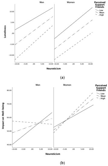(a) Regression of loneliness on neuroticism at three levels of perceived support from friends by gender; (b) regression of well-being on neuroticism at three levels of perceived support from friends by gender. Values are plotted using simple slopes equations of the regression for conditional effects of perceived support at three levels, for men (left) and women (right).