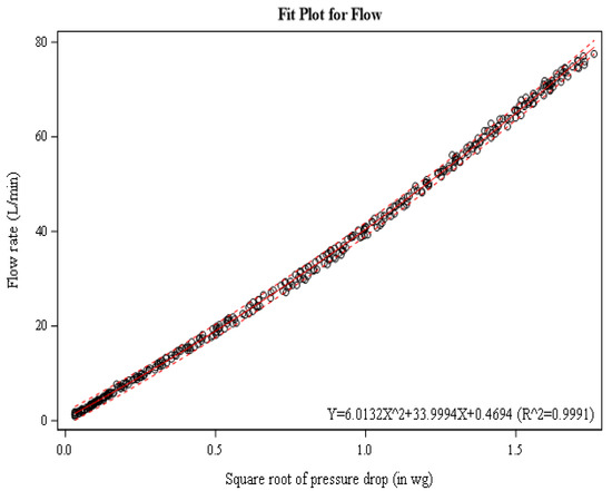 Once printed and cleaned, all flow cells were evaluated for their relationship between pressure drop and flow rate to determine the variability in our production process. This was performed by drawing a known flow rate through the flow cell from 0–70 L/min. A challenge flow was generated using a scroll type vacuum pump, metering valve, and verified with a primary standard flow meter with +/− 1% accuracy (Defender 520, Mesa Labs, Lakewood, CO, USA). The pump flow was pass through two separate 1L vessels to act as pulsation dampeners prior to connection to the flow cell mouthpiece. For initial validation, pressure differential measurements were collected for each of the 10 replicate flow cells using a digital manometer (DP-Calc Micromanometer 5825, TSI, Shoreview, MN, USA). The manometer was set to 1 s averaging and measurements were read from the screen and recorded manually. A best fit regression for all combined flow cell measurements was used to form a prediction equation representing all flow cells. Using a statistical analysis software (SAS version 9.4), a 95% confidence limit of the regressions was calculated to show the reproducibility of our flow cell fabrication process. The relationship between pressure and flow rate was expected to follow a second order (quadratic) relationship based off the Bernoulli equation solution; therefore, modeling began with this theoretical basis. This means that a linear relationship was expected between the square root of pressure and flow rate. Overall, the relationship was well modeled as linear with R2 = 0.998; however, model residuals were systematically biased. Therefore, a quadratic regression of the square root of pressure was used to balance the residuals. Using a quadratic regression of the square root of pressure to model flow also slightly improved the overall fit of the regression to R2 = 0.9991.