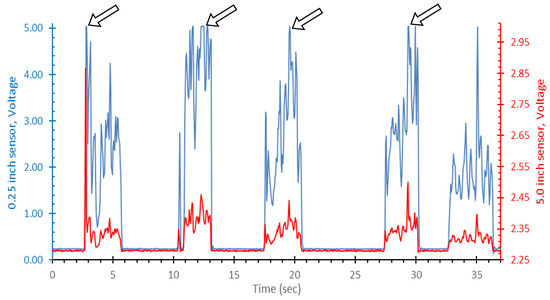 A representative sample plot of sensor voltage (y-axis) versus time (x-axis) for 0.71 L challenge puffs conducted at low flow. The left-hand scale (blue) corresponds to the 0.25-inch sensor signal. The right-hand scale (red) corresponds to the 5.0-inch sensor signal. The 0.25-inch sensor is displayed across its full measurement range while the 5.0-inch sensor is only displayed across the observed values. Arrows are pointing to instances of signal saturation from the 0.25-inch sensor.