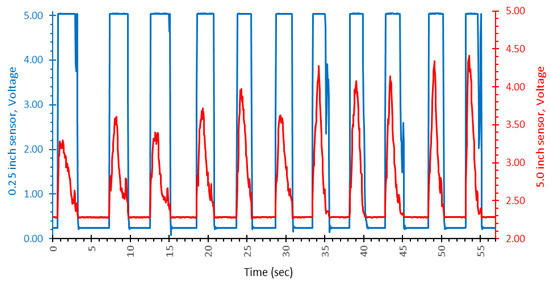 A representative sample plot of sensor voltage (y-axis) versus time (x-axis) for 2.00 L challenge puffs conducted at high flow. The left-hand scale (blue) corresponds to the 0.25-inch sensor signal. The right-hand scale (red) corresponds to the 5.0-inch sensor signal. Note the pronounced signal saturation in the 0.25-inch sensor as characterized by the flat-topped peak.