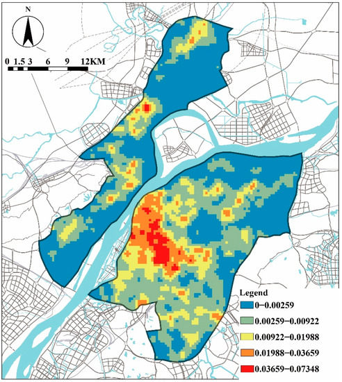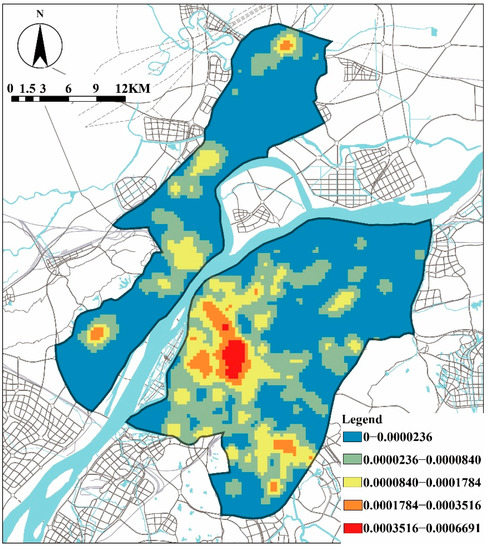 Table 3 shows the average, maximum, and minimum number and the standard deviation for each food outlet within the aforementioned buffers for the 517 respondents. The density of different food outlets was highly correlated among them (correlation coefficient 0.375–0.965, p < 0.000), and this also had a positive relationship with the population density of the city (Figure 1 and Figure 2).