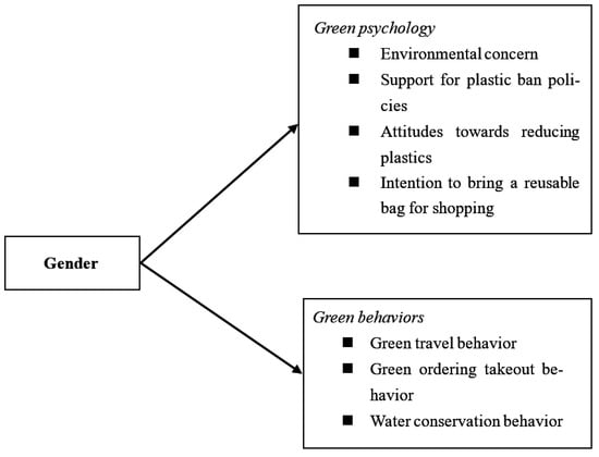 Based on the findings of a similar study done by Wang and Li [17], which proposes that females would have a more positive green psychology and conduct more positive green actions than males in China, this study firstly examines gender differences in environmental psychology, including environmental concern, support for plastic ban policies, attitudes towards reducing plastics, and intention to bring a reusable bag for shopping. Second, this study investigates gender differences in pro-environmental behaviors, including green travel behavior, green ordering takeout behavior, and water conservation behavior. The research model of this study is displayed in Figure 1.