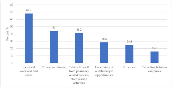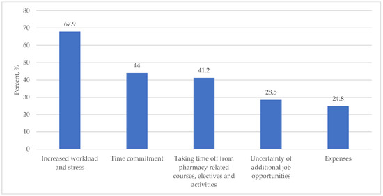 Of the randomly selected institutions, we had a 65.7% response rate with an overall good variation of male (56%) and female (44%) respondents. The majority (84.8%) of students thought they understood the pharmacist’s role in public health “very well”, and for “well”, most (68.6%) see themselves playing a role in public health in the future. Almost all surveyed students (97.1) were very or somewhat interested in having a public health involvement in their pharmacy career, and only 6.8% stated that they are not likely to be enrolled in a PharmD/MPH dual program. Only 1.1% did not think such a program would be attractive to future pharmacy students. Moreover, perceived advantages of such a program were mainly for having increased job opportunities (80.1%), followed by an increased ability to serve patients (71.8%) and the community, and finally, increased knowledge and an understanding of public health concepts (70.6%), whereas perceived limitations mainly concerned an increased workload and additional stress (67.9%). Overall, the findings of this study are very similar to that of previous feasibility studies done by Holtzman et al., suggesting a willingness, preparedness, and enthusiasm of adding this dual degree of PharmD/MPH to pharmacy schools [14,15]. Assessing the perception of key stakeholders for the development of such a program can be considered for future studies at the international level, which may help in comparing the different viewpoints for pharmacy students at the global level.