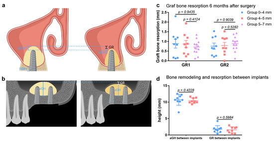 Analysis of bone remodeling and resorption. (a) schematic diagram of aGH and GR at implant site. (b) schematic diagram of aGH and GR between implants. (c) graft bone resorption at implant site 6 months after surgery. (d) bone remodeling and resorption between implants.