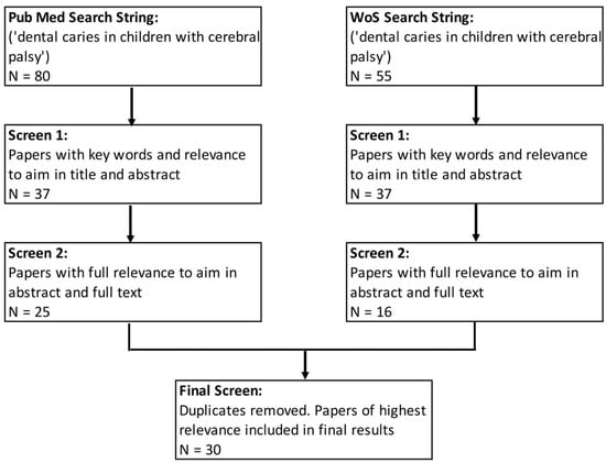 In the first screening process, abstracts and titles were scanned for keywords such as ‘dental caries’, ‘cerebral palsy’, ‘oral motor function’, ‘demographics’, ‘cerebral palsy sub-type’, ‘nutrition and diet’, ‘socioeconomic’, and ‘dental habits’. The analysis of full texts was performed in the second screening. Duplicate papers present in both PubMed and WoS were accounted for. The search was restricted from 1983 to 2018 to provide a 35-year time frame for analysis. Six reviewers independently reviewed each article with calibrated Microsoft Excel forms to chart data, identify risk factors, and note study characteristics. Findings were then presented in group workshops to reach a consensus on study selection and categorization of risk factors (Figure 1). This included analyzing demographics, independent and dependent variables, significant findings, and the conclusions of each paper. Risk of bias for each article was similarly conducted based on the National Heart, Lung, and Blood Institute (NHLBI) Quality Assessment Tools for Cross-Sectional Studies and Case–Control Studies, and results were calibrated in group discussion. Journals that were poorly translated or not available in English were excluded due to the potential for misinterpretation by the reviewers.