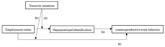 This article sets out to investigate the relationship between employment status and CWB by virtue of social identity theory. We first focus on the mediating role of organizational identification, which is defined as “perception of oneness with or belongingness to an organization, where the individual defines him or herself in terms of the organization(s) in which he or she is a member” [11]. Drawing on social identity theory, when employees perceive that they are part of the organization, they establish their self-concept, subsequently allowing them to identify with the organization and finally improve their positive attitude and constructive behaviors [12]. Because of the employment status differences between temporary employees and permanent employees, they may show differences in organizational identification and CWB. We then examined the impact of turnover intention on the process of displaying CWB. From the perspective of social identity theory [13], organizational identification results in a construction process that is affected by many factors. In a multi-employment situation, temporary employees have a high planned turnover intention due to a fixed contract duration [14]. Those with uncertain jobs will not invest too many personal resources to establish deep employee–organization relationships. When employees conceive of an internal intention to leave, it generates an effect that influences their psychological state and behavior [15].