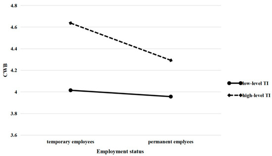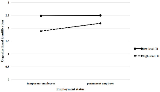 Furthermore, turnover intention moderates the relationship between employment status and organizational identification, which in turn affects employees’ CWBs. Figure 3 shows that temporary employees who have a strong intention to leave experience a bigger decline in organizational identification than permanent employees, which could affect their CWBs. In contrast, permanent employees’ organizational identification and CWB show a gentler change when their turnover intention varies. The reason is that, except for formal status, permanent employees generally experience higher job satisfaction and positive psychological contracts and are treated better than temporary employees in terms of compensation and benefits [5,64]. Although they do not plan to be members of the organization in the future, organizational identification built on positive psychological factors will be maintained for the necessary period. For temporary employees, however, inferior treatment may result in their feeling ostracized. Once they decide to resign, their low-level organizational identification deteriorates quickly [32], which subsequently elicits CWBs.
