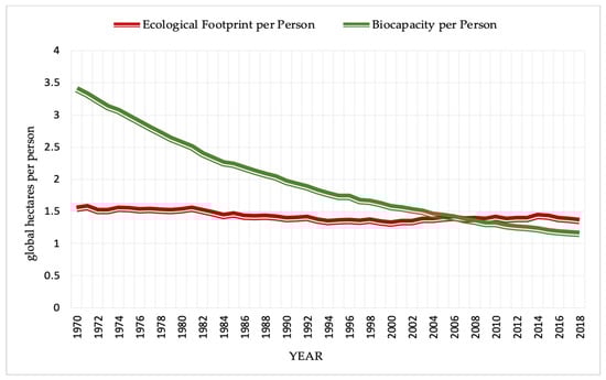 Each African country has its ecological footprint data, even though most countries have similar characteristics. Africa is in an ecological deficit; its production footprints are greater than its biocapacity, implying domestic natural capital is being destroyed by emitting more carbon dioxide than the environment can absorb. Africa’s ecological footprint was 1.35 hectares per person in 2018, which is much less than the world average of 2.8 hectares per person and a biocapacity of 1.15 hectares per person. Gabon, Congo, and the Central African Republic are among the top ten nations globally with the highest biocapacity compared to the population. Africa experienced a constant decline in biocapacity from 1960 until 2014, when an ecological deficit was recorded in 60 percent of countries on the continent [33]. Since then, the ecological deficit has been increasing, and though minimal compared to the world average, it is a cause for concern. The ecological footprint and biocapacity per capita of Africa are illustrated in Figure 1.