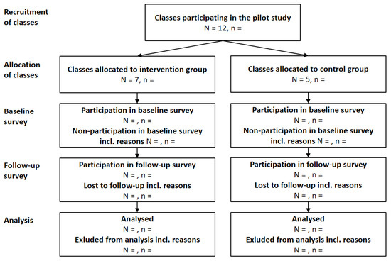 An overview of the recruitment strategy is provided in the CONSORT flowchart (Figure 1). While all classes of any grade including primary schools can participate in the PCS, the pilot study specifically targeted adolescents. We therefore recruited a convenience sample of classes covering grades 7 to 13 (mostly attended by adolescents aged 12 to 19 years) to participate in the pilot study. With the aim of preparing a pragmatic effectiveness study, we did not specify further inclusion or exclusion criteria for classes. In October 2021, using the newsletter of the PCS, we invited all 7500 schools in 14 federal states as well as 64 schools that had participated in previous PCS and were registered for the present PCS to participate in the pilot study. By 19 November 2021, twelve classes from five schools had consented to participate in the pilot study.