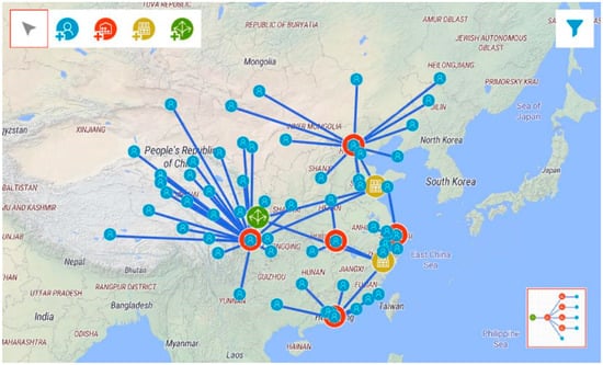 China produces about 50% of masks used in the world. China’s lockdown measures to prevent the COVID-19 pandemic have caused the disruption of mask production, leading to a severe shortage of masks [63]. It is time for the mask supply chain to develop effective measures to mitigate the risk of supply chain disruption and improve the resilience of the supply chain. To the best of our knowledge, a typical mask supply chain is primarily composed of suppliers, manufacturers, distributors, and retailers [64]. Therefore, we simulate a four-stage supply chain that includes 1 supplier (in Guangyuan), 2 factories (in Xingtai and Lishui) and 2 distribution centers (in Chengdu, Wuhan, Shenzhen, Beijing, and Shanghai), and 60 retailers (clinics) scattered all over China. The overall supply chain structure is shown in Figure 1.