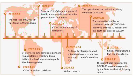 The supplier transports the raw materials to two factories within three days, and these factories process the raw materials into finished products and then ship them to distribution centers. Customers across the country obtain their goods from distribution centers. Customers order 80–100 packs of masks from the distribution center every 10 days with an expected lead time between 5 and 8 days. If the delivery time of the order exceeds eight days, it is regarded as delayed delivery, which negatively affects the service level. The factories and distribution centers adopt the (s, S) inventory policy. That is, when the inventory level is below a fixed replenishment point (s), the downstream members order raw materials/products from the upstream members until the inventory quantity reaches S. To reduce cost and save time, materials and products are shipped according to the principle of nearby transport, which means that downstream supply chain members always obtain corresponding orders from nearby upstream members. Trucks with a speed of 50 km/h and a capacity of 80 m3 are the main transport vehicle in this supply chain network. When the supply chain network operates normally, the delivery time from the supplier to the factory is three days, the delivery time from the factory to the distribution center is two days, and the orders shipped from DCs to customers take two days. The COVID-19 pandemic broke out in Wuhan, China, and it quickly spread to the whole country and other countries around the world. The operation of the supply chain is facing enormous challenges due to facility disruptions and supply and demand shocks [8,55]. To show the propagation process of the coronavirus in details, we summarize the key events nodes from December 2019 to September 2020, as shown in Figure 2.