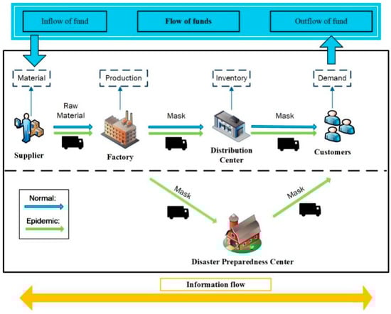 The following Figure 3 shows material and information flow in the supply chain and the transport routes in normal and outbreak situations. The demand generated in the market is normal distribution, and customers order from the distribution center. The DCs/factories order products/raw materials from the upstream echelon according to the (s, S) inventory policy. When the supply chain is disrupted by the outbreak of the epidemic, the remaining capacity is randomly allocated to the downstream of the supply chain [16].