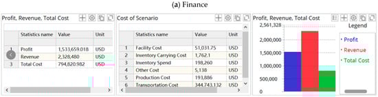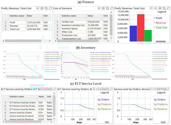 Based on the above analysis, we firstly simulate and analyze the supply chain’s operation and performance without disruption with the usage of the SIM Global Network Examination scenario in ALX, and the results are shown in Figure 4.