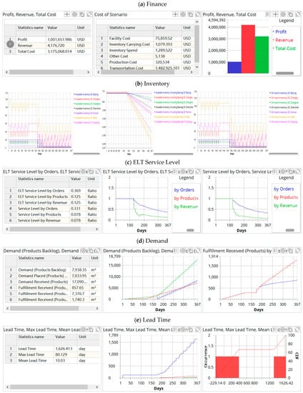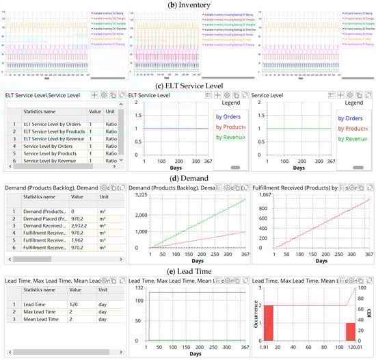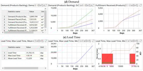 KPIs of the redesigned supply chain in scenario 18. (a) Finance; (b) inventory; (c) ELT service level; (d) demand, where the titles are Demand (Products Backlog), Demand Placed (Products) by Customer (left), Demand Received (Products), Fulfillment Received (Products On—time) (middle), Fulfillment Received (Products), Fulfillment Received (Products) by Customer (right); (e) lead time.