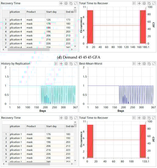 Figure 8a,b reflect that the supply chain has a degree of risk resistance and stability so that the supply chain can withstand the impact of short-term disruptions. However, in the face of the challenges of prolonged disruption and demand shock, the supply chain operating system may be compromised. As shown in Figure 8c, the service level is lower than 0.7 on the 126th day. The overall recovery time is 180.1 days. Figure 8d shows that the service level is lower than 0.7 on the 176th day, and the redesigned supply chain recovery time has been greatly shortened to 133.1 days.