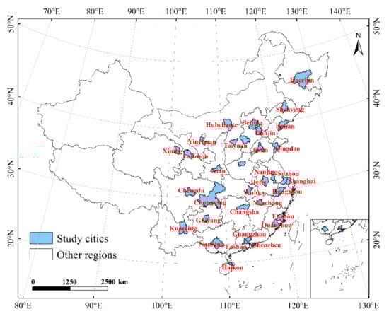 Due to concerns about city representativeness, data integrity, and availability, this study exclusively uses 34 metropolitan administrative regions in mainland China as research objects, including Beijing, Shanghai, Guangzhou, Shenzhen, and Hangzhou. The research areas selected in this study are all economically developed cities, which can represent China’s economic operation to a large extent, mainly provincial capitals and cities with very high GDP in the region. The GDP of these cities ranks among the top in their respective provinces. As shown in Figure 1: