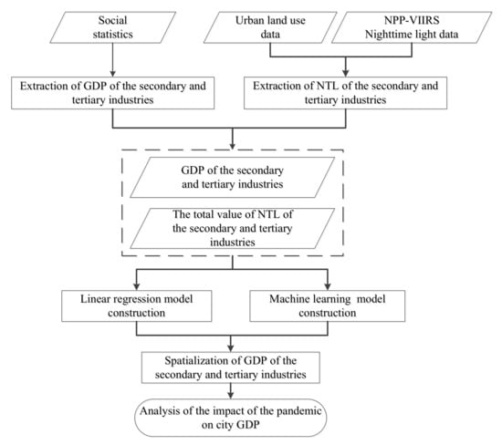 Based on NTL images, urban land use data and GDP of secondary and tertiary industries, this study designed and constructed a GDP spatialization method to analyze the spatiotemporal variation characteristics of GDP in major Chinese cities during the pandemic. The specific research process is shown in Figure 2.