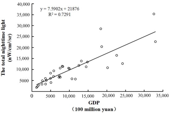 There is a significant linear association between GDP and the total value of NTL, according to existing studies. This study also establishes the relationship between the total value of NTL and urban GDP in 2018 (Figure 3), which proves that the total value of NTL has a linear relationship with urban GDP. As a result, based on the GDP of secondary and tertiary industries and the total value of NTL in 34 major cities in mainland China in 2018, this research constructs a GDP linear regression model. This research chooses a linear regression model with no constant term for GDP spatiotemporal adjustment, taking into account the problem of downscaled GDP estimation accuracy. The following is the model formula: