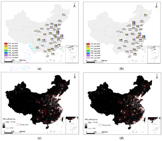 The DNB cloudless moon composite and the NPP-VIIRS annual composite NTL data are preprocessed in this study. The preprocessing mainly includes the following steps: cropping the data, transforming the projected coordinate system to the Albers projected coordinate system, and resampling to 500 m spatial resolution. The annual NTL data go through several steps of processing to remove cloud cover, lunar contamination, background noise, outliers, and fires and stray light, which are not related to electricity []. Although the monthly NTL data removes the influence of cloud cover, some preprocessing is required before use. This study uses the 2020 annual product as standard data to correct the monthly composites for January–June 2020. This study sets the negative value of monthly data to 0 to remove the influence of background noise. Beijing, Shanghai, Guangzhou and Shenzhen are the most developed cities in China, therefore, the DN values of other regions should theoretically not exceed the DN values of these cities. The highest DN value of these cities was used as a threshold to detect outliers in other cities in the study area, and if the DN value of some pixels was greater than the threshold, the DN value of the annual product was selected for a second comparison to remove possible causes due to fires, ships, outliers caused by stray light. Afterward, the final corrected NPP-VIIRS monthly imagery is generated, with all NTL pixels below a threshold in every city in the study area.