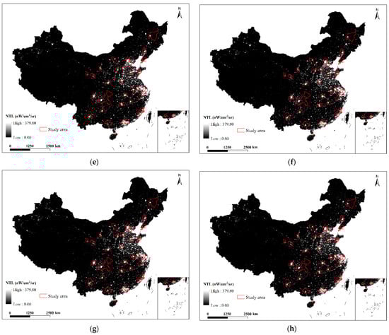 The Earth Observation Group (EOG) (https://eogdata.mines.edu/nighttime_light/monthly/v10/) (accessed on 23 November 2021) at the Colorado School of Mines produced NPP-VIIRS NTL images, which are cloudless moon composites and annual composites collected by a diurnal band (DNB) sensor. DNB cloudless moon composites and annual composites eliminate the effects of stray light, fire, and other transient light and remove the effects of clouds, emitted moonlight, etc. However, light from aurora, flames, ships, and other temporal lights are still present in the monthly composition, preprocessing of the images, such as the removal of outliers and background noise, is required for the images. The NPP-VIIRS NTL images used in this study are more radiometrically accurate than the Defense Meteorological Satellite Program/Operational Line Scan System (DMSP/OLS) and provides on-board calibration to ensure data accuracy and stability []. Meanwhile, NPP-VIIRS NTL images have a greater spatial and radiometric resolution than DMSP-OLS for detecting NTL. NPP-VIIRS NTL imagery actually eliminates three key issues that plague traditional satellite programs oversaturation, bloom, and lack of on-board calibration [].