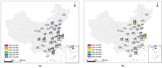This research used the corrected NPP-VIIRS NTL data and the spatial correction method to produce the spatialized findings of the monthly GDP of the secondary and tertiary industries in 34 Chinese cities from January to June 2020 based on the GDP estimation model in Section 2.3.4. The results show that there are obvious differences in the spatiotemporal distribution of GDP in different cities, but there are also certain similarities.