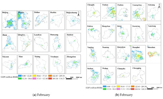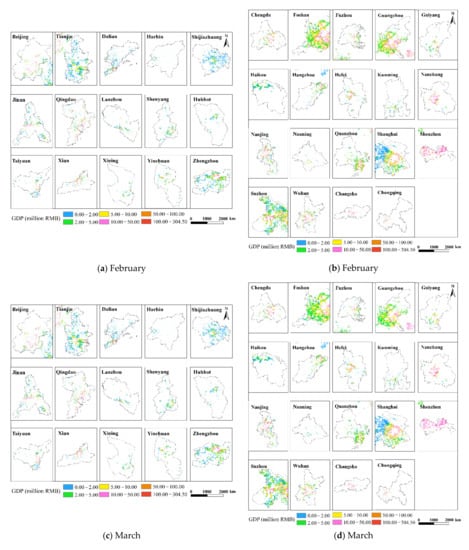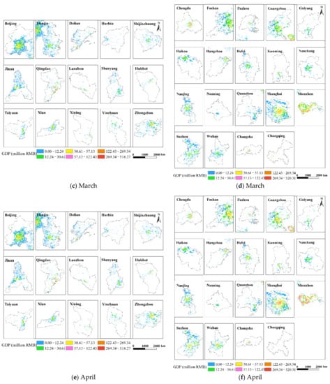 This study only displays the results of the spatial distribution of GDP from February to April because the economic development patterns of cities will not change considerably in a short period of time (Figure 6 and Figure 7). The findings reveal that there are huge spatial differences in GDP within each city, as well as large spatial differences between cities. Cities such as Beijing, Shanghai, Guangzhou, Shenzhen, Chongqing, Chengdu and Suzhou have developed economies with relatively high GDP. In these cities, the GDP of many urban construction land is at a high level, and at the same time, these urban construction land has obvious agglomeration. In addition, cities such as Hangzhou, Nanjing, Wuhan, and Tianjin have relatively developed economies, and there are also a small amount of urban construction land with high GDP levels. However, cities such as Yinchuan, Haikou, and Xining have slow economic development, low urbanization rate, and generally low GDP of urban construction land. The economic impact of the COVID-19 pandemic on cities with different levels of economic development and industrial structures will also vary.