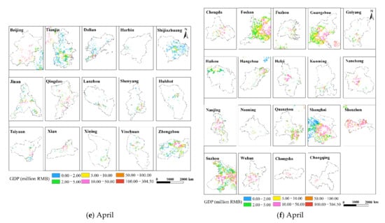 The GDP of major Chinese cities fell in February 2020 compared to January, but the negative trend in most places had dramatically improved as China’s COVID-19 pandemic was gradually brought under control. Some cities began to restart work in early March, and by the end of the month, the work resumption index in most cities was above 70% []. In March, the economy showed signs of improvement, with the GDP of most major Chinese cities trending upward. In March 2020, cities including Beijing, Shanghai, Shijiazhuang, Changsha, and Tianjin had a noticeable GDP recovery. The GDP per unit construction land in most cities had increased, and the GDP per unit construction land in cities with high GDP growth had increased even more, indicating that these urban building lands had obvious agglomeration. Although some cities, such as Guangzhou, Shenzhen, Wuhan, Harbin, and Quanzhou, have positive GDP per unit of construction land growth, the majority of GDP per unit of construction land growth was negative. The overall level of GDP in March remained in a declining trend, and the economic recovery was slow. Most of these cities’ GDP per unit of building land did not reach a positive growth level until April.