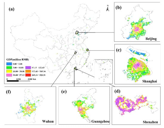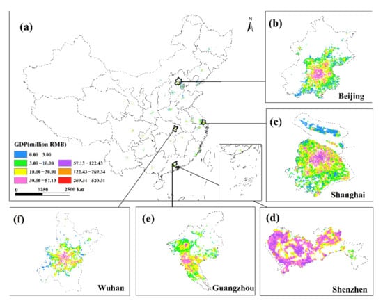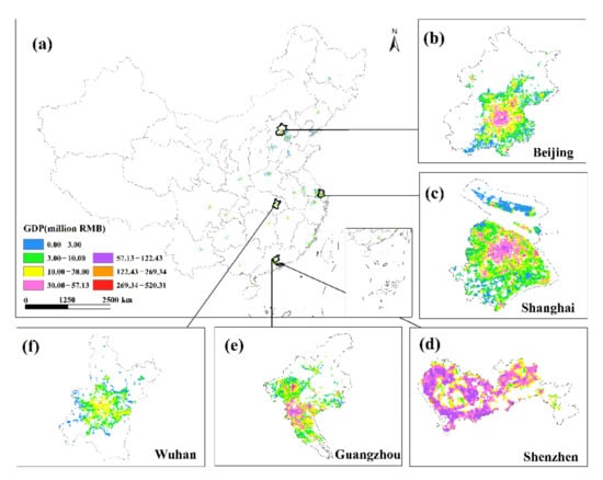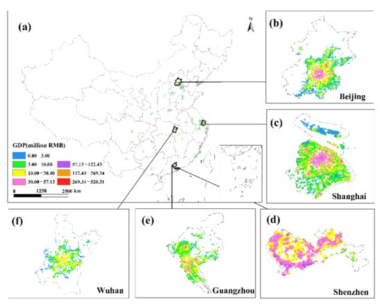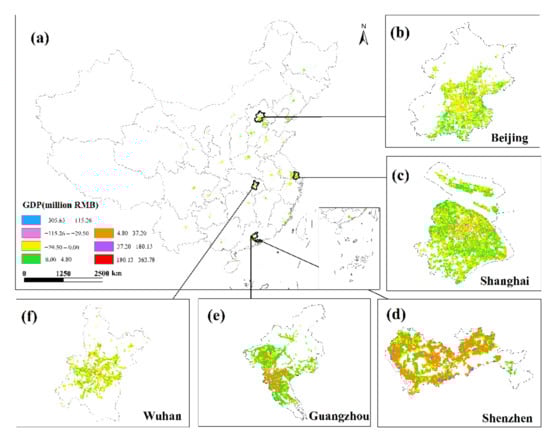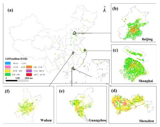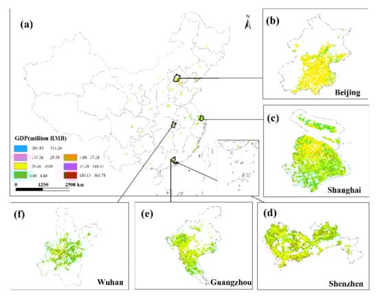 The spatial distribution of the total GDP of the secondary and tertiary industries in June 2020. (a) The spatial distribution of the total GDP in 34 Chinese cities; (b) Beijing; (c) Shanghai; (d) Shenzhen; (e) Guangzhou; (f) Wuhan.