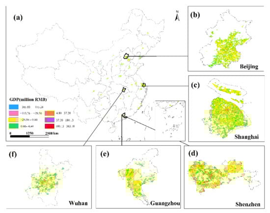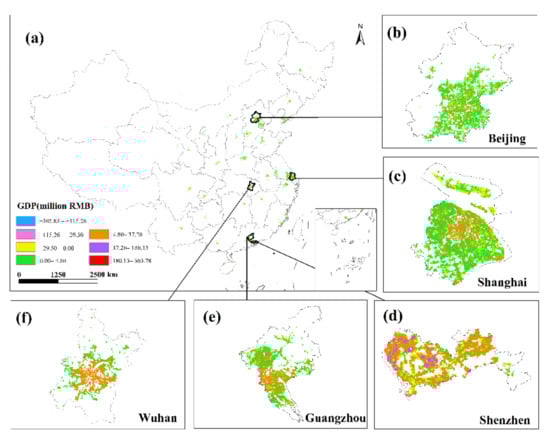 The spatialized result of the sum of GDP in May minus the sum of GDP in April. (a) The changes in GDP of 34 cities in China from April to May; (b) Beijing; (c) Shanghai; (d) Shenzhen; (e) Guangzhou; (f) Wuhan.